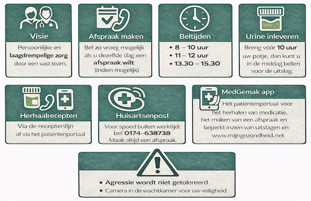 Voor spoed buiten werktijden kunt u contact opnemen met de huisartsenpost Westland: 0174-638738.